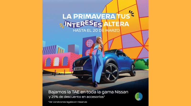 Hasta el 20 de marzo los clientes que compren un vehículo nuevo Nissan podrán beneficiarse de la campaña de Nissan “La primavera, tus intereses altera” con una bajada al 4.9% T.A.E, hasta 1000 euros de descuento en toda la gama Nissan (vehículos en stock), tres años de mantenimiento oficial Nissan de regalo (sujeto a financiación) y un descuento del 25% en accesorios.