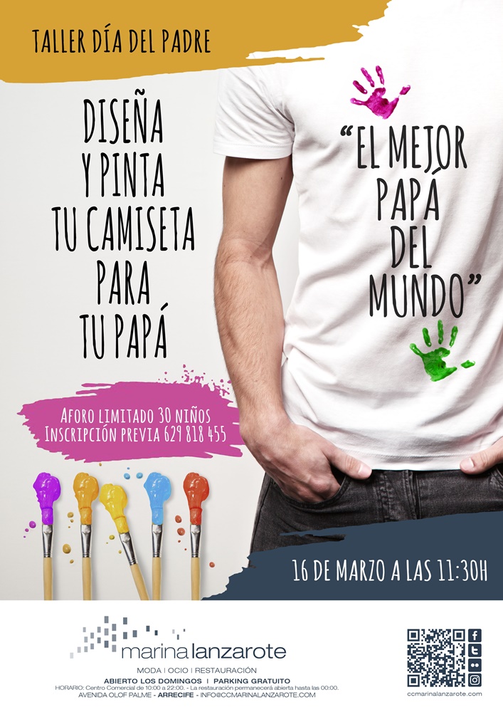 Marina Lanzarote quiere celebrar el Día del Padre con una jornada más que especial para que compartan con sus hijos un rato con las manualidades. Será este sábado 16 de marzo a las 11.30 horas, donde pequeños y grandes podrán elaborar una camiseta.