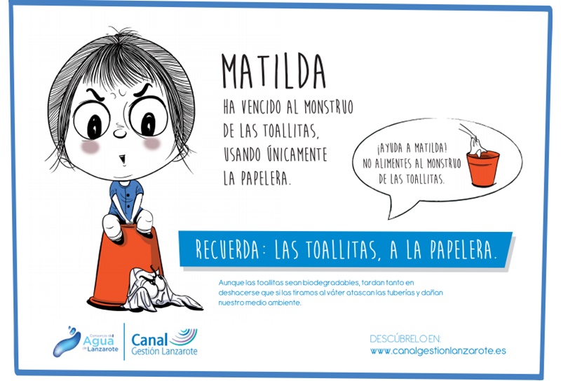 Se trata de crear concienciación sobre los problemas que este acto origina en la infraestructura de alcantarillado y saneamiento de la isla, especialmente en las estaciones de bombeo de aguas residuales que se ven seriamente afectadas por la acumulación de este tipo de residuos, además de las consecuencias medioambientales que genera. Para que el mensaje sea de fácil comprensión y asunción por parte de la población, y especialmente de los más pequeños, Canal Gestión Lanzarote ha creado a Matilda, una niña preocupada por el medio ambiente.