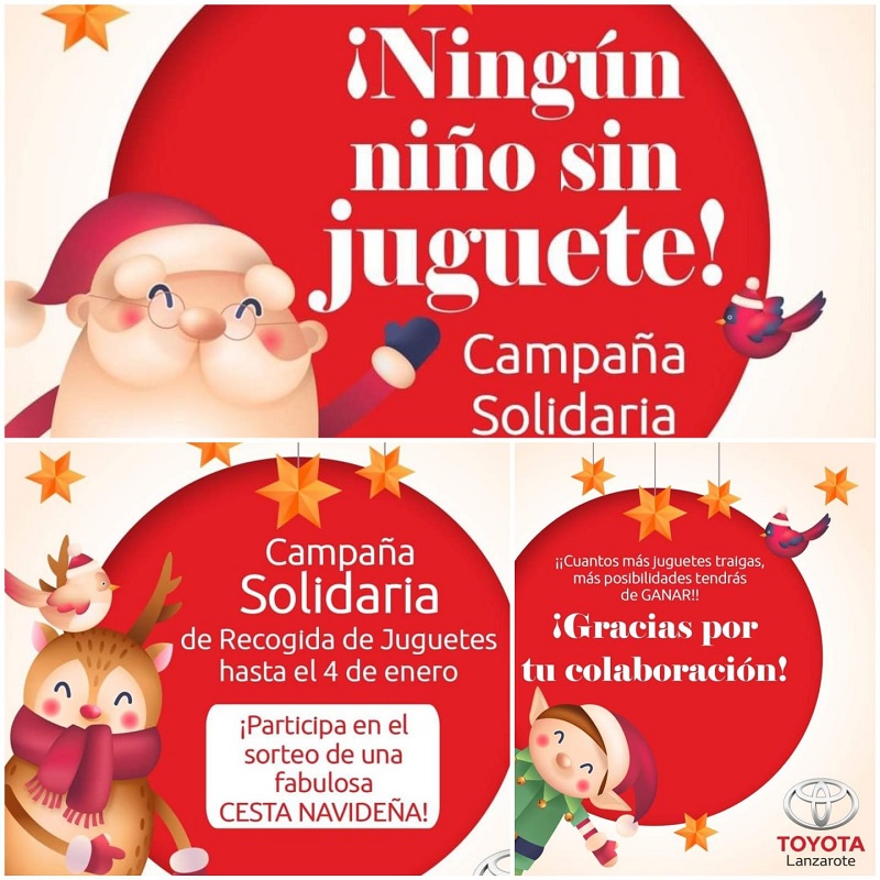 Hasta el 4 de enero, todos los lanzarteños tendrán la opción de acercarse a las instalaciones de Toyota -Carr. de San Bartolomé, 93, 35500 Arrecife- para donar su juguete ya sea nuevo o seminuevo. Los trabajadores de Toyota recibirán los presentes que cada cual pueda aportar y ellos mismos se encargarán de envolverlos. Aquel que se anime a participar recibirá como "premio" un ticket para una gran cesta de Navidad.