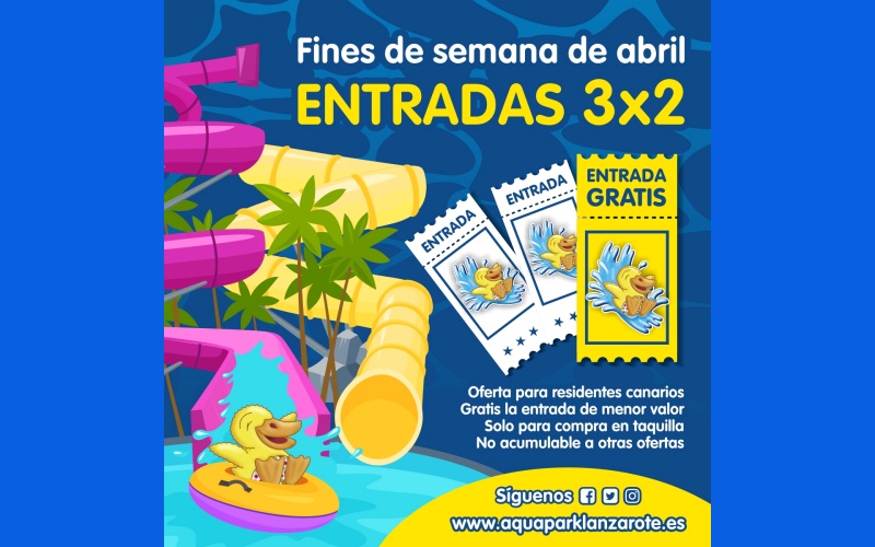Llega el buen tiempo, por este motivo, durante todos los fines de semana del mes de abril, Aquapark Costa Teguise lanza una oferta muy especial de tres entradas al precio de dos.