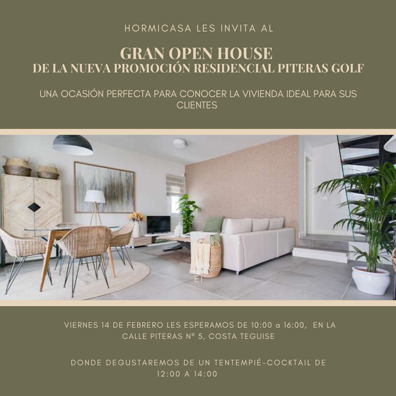 Hormicasa presenta Gran Open House, de la nueva promoción residencial Piteras Golf, y lo hace en una jornada informativa que tendrá lugar el viernes 14 de febrero, desde las 10:00 a las 16:000 horas, en la calle Piteras, número 5, de Costa Teguise. La ocasión perfecta para conocer la que podría ser su vivienda ideal.