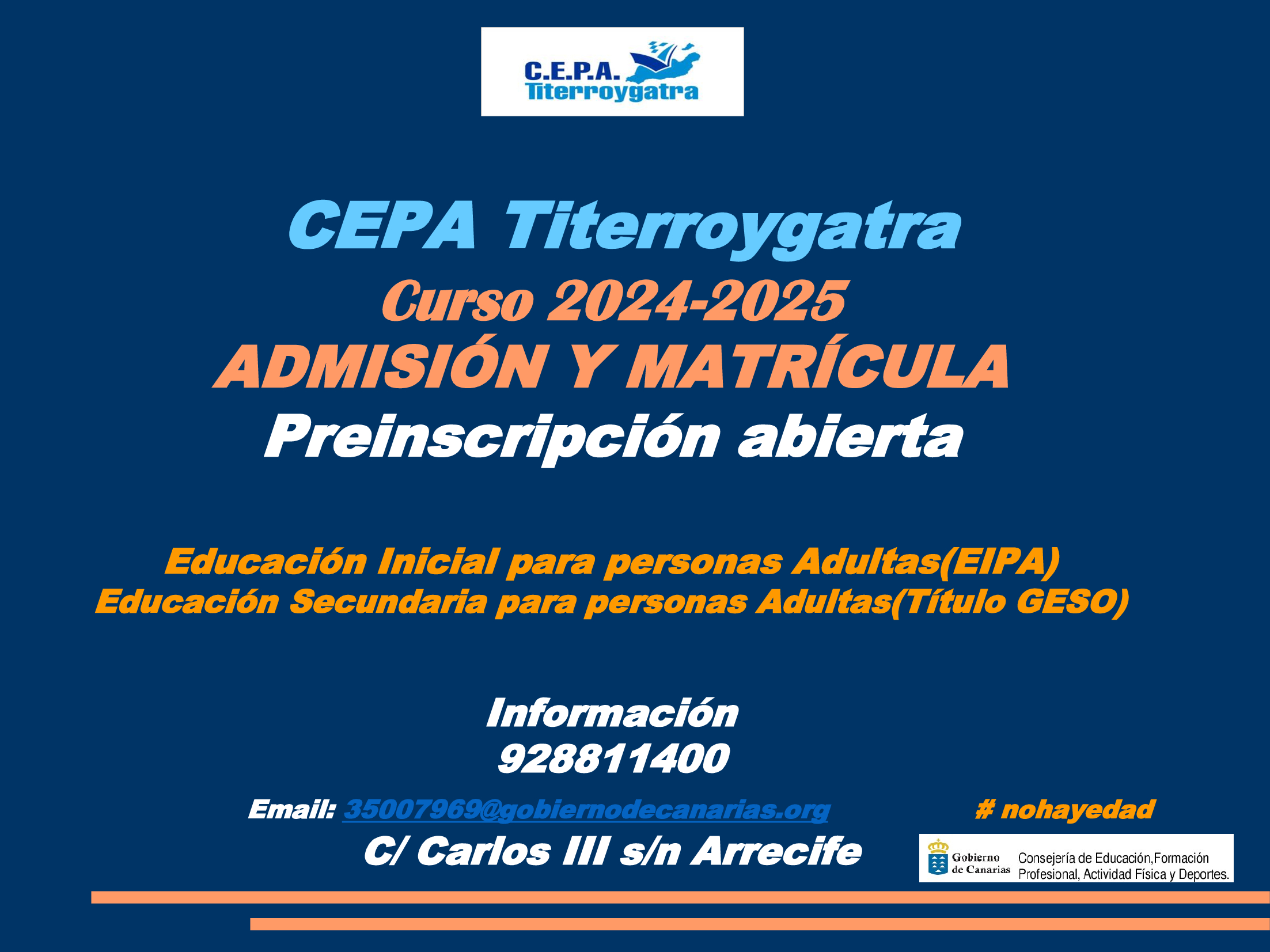 Si te interesa seguir formándote, el proceso de admisión y matrícula de alumnado en el Centro de Educación de Personas Adultas CEPA Titerroygatra para el curso 2024-2025 permanece abierto con su oferta formativa:
