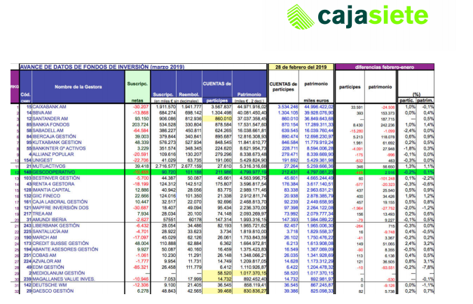 Al cierre del primer trimestre de 2019, según los datos provisionales de Inverco, Gescooperativo se situaba en la duodécima posición del ranking con un patrimonio de prácticamente 4.800 millones de euros, tal y como se refleja en la imagen adjunta. Asimismo a 31 de marzo pasado contaba con un total de 211.986 partícipes.