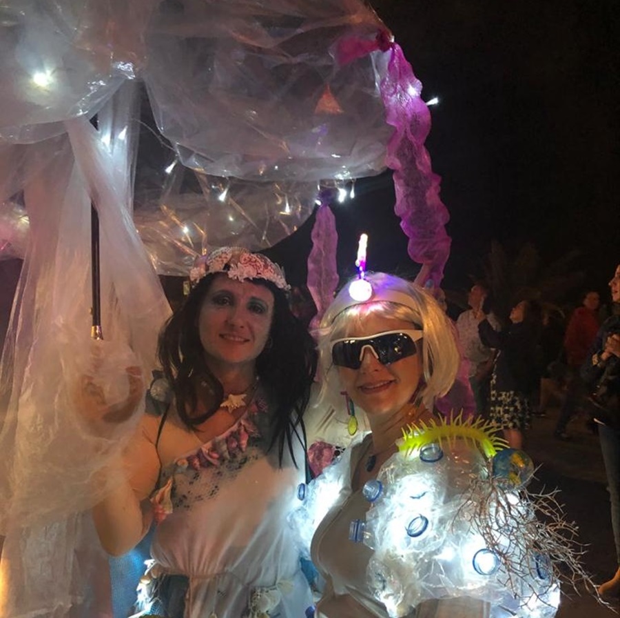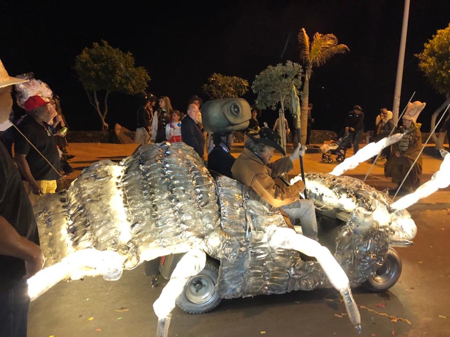 "De mares lejanos llegaron ellos. Seres mutados surcando las aguas en su nave bio-plástica. Pescando y recogiendo los desechos que los humanos con su egoísmo e idiotez abandonaban en los mares de aquel pequeño planeta azul". Así se presentaba 'Eco-Lola y los pescadores de plástico', la original carroza de material reciclado del Rancho Texas que desfiló el sábado en la cabalgata de Carnaval de Puerto del Carmen, en el municipio de Tías. En el vídeo que se adjunta podemos ver el paso de esta original carroza por la Avenida de Puerto del Carmen.