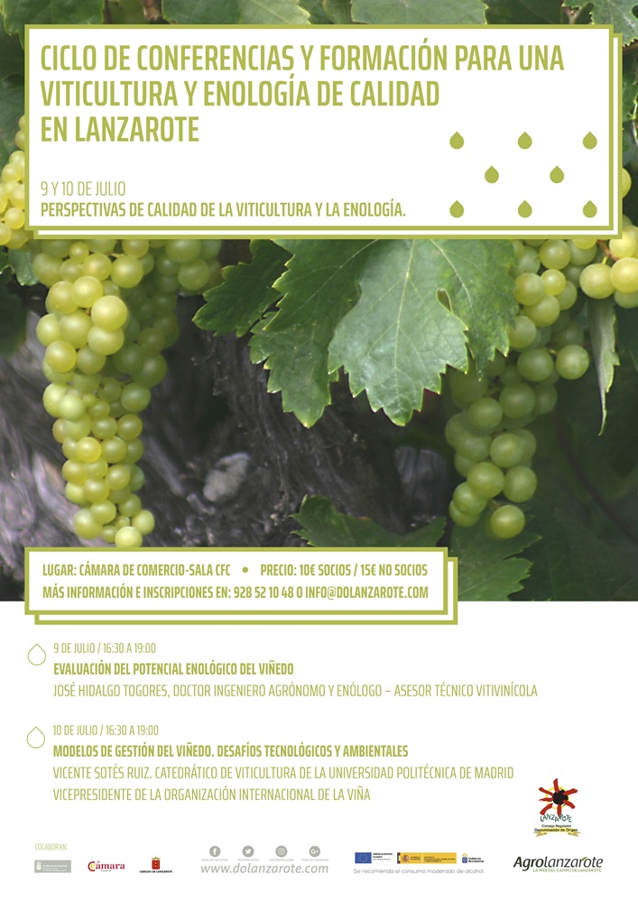 El 9 y 10 de julio tendrán lugar las dos últimas jornadas del “Ciclo de conferencias y formación para una viticultura y enología de calidad en Lanzarote”. En esta ocasión, José Hidalgo Togores, asesor técnico vitícola y Vicente Sotés Ruiz, vicepresidente de la Organización Internacional de la Viña, será los encargados de abordar las charlas tituladas “Perspectivas de calidad de la viticultura y la enología”. Nereida Pérez, secretaria del Consejo Regulador, indica que “estas charlas están enfocadas a todas aquellas personas interesadas en aprender técnicas y metodologías en vitivinicultura. Creemos que es muy importante ofrecer este tipo de formaciones y para ello hemos contado con diferentes expertos del país”. Las inscripciones para las dos charlas son de 10€ para socios y de 15€ para no socios.
