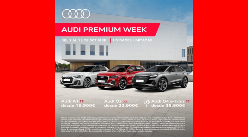 Vuelve Audi Premium Week. La marca líder del mercado premium en Canarias le da la bienvenida al otoño con una campaña que incluye un Audi para todos los gustos y necesidades. A partir del 1 de octubre y hasta el 15 del mismo mes, todos los canarios tendrán la oportunidad de conseguir el coche de sus sueños a un precio irrepetible. Ahora, además, con entrega inmediata en unidades limitadas. ¿Te lo vas a perder?