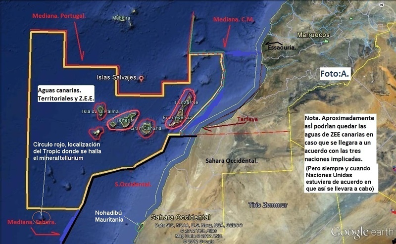 Si nos atenemos a lo que se divulga en el artículo 76 de la página 63 de La Ley del Mar, que es lo que alegan algunos políticos canarios para reclamar los yacimientos, entonces por causa de que Canarias no es un Estado Archipelágico y también porque “Tropic” se halla unas 23 M/n más cerca del Sahara que de nuestro archipiélago, el yacimiento habido en “Tropic” podría pertenecer antes a los saharauis si Naciones Unidas les concediera las 150 M/n de plataforma extra. E incluso el resto de los volcanes submarinos: Las Hijas, Bimbache, Echo, Paps, Pelicán, Ico, Infinito y Drago, porque todos estarían dentro de las 150 M/n de plataforma extra que le podría corresponder al Sahara. Pero creo que esos volcanes submarinos incluyendo “Tropic” no podrán pertenecer a Canarias ni tampoco al Sahara, porque por una parte nuestro archipiélago no posee aguas de ZEE y por otra, porque están fuera de las 200 M/n que podría obtener el Sahara cuando se independizara. También las 150 M/n de plataforma extra el Sahara no las podría obtener porque la isóbata de la zona donde están las islas submarinas supera los 2.500m de profundidad.