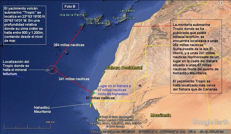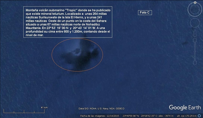 Los 9 volcanes submarinos se encuentran desperdigados rumbo Sur/suroeste de la isla El Hierro: Las Hijas se halla a unas 41M/n. Bimbache, Echo y Paps a unas 105M/n. Pelicán e Ico a 155 M/n. Infinito y Drago a 195 M/n. Y “Tropic” donde se halló el (tellurium=telurio) a 264 M/n Sur/suroeste de la Isla El Hierro, y a 241M/n Oeste de un punto de costa localizado en el Sahara a 67 M/n norte del puerto de Noahadibú Mauritania. Ver fotos A,B y C.