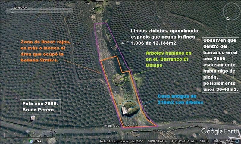 (6). Sigue usted señor Stampa alegando unos cuantos más errores que le indujeron los supuestos ecologistas. Por ejemplo dice usted: “Del Barranco El Obispo se extrajo unos 44.000m3 de piedra y tierra, y según usted informa en la acusación contra Stratvs, mientras se excavaban fueron depositándose en la finca que JFR posee en Uga”. ¡Uiii señor Stampa¡ mire Google Earth y busque fotos de fechas con el reloj del tiempo para que compruebe que la bodega Stratvs más o menos en el año 2005 ya tenía terminada su excavación y sus bases cementadas, y la finca de Uga no se comenzó a restaurar hasta después del año 2008. Aparte de la zona de Stratvs lo que se escavó fueron unos 5.000m3 que se usaron para rellenar los laterales de la misma Y el porqué no se excavó tanto como usted alega en la acusación, fue debido a que la bodega se hizo escalonada, prueba de ello es que aun existen detrás de la zona del restaurante los árboles antiguos que estaban en sitiun antes de que se interviniera en El Barranco El Obispo. Asimismo por causa del escalonamiento no hubo necesidad de excavar en la zona donde se fundó el restaurante, área que usted acusa como que fue excavada.