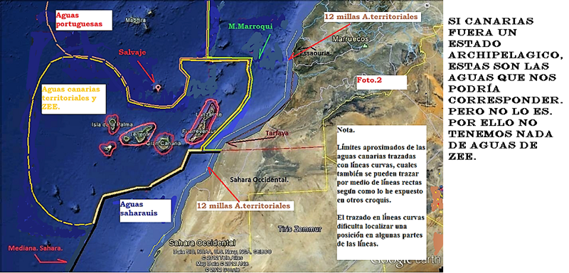 Canarias según La Ley del Mar no posee aguas de ZEE donde entran las 12 millas náuticas de aguas territoriales también llamadas aguas jurisdiccionales. Esta minusvalía se debe a que Naciones Unidas sólo da derechos de ZEE a naciones continentales= ribereñas y a Estados Archipelagicos.