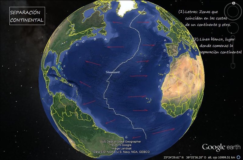 (4). Mientras se daba el estiramiento de las placas tectónicas en la expansión de mar que se estaba formando, se fueron produciendo varias fisuras en la corteza terrestre del lecho marino, que dio lugar a que se creara el Sea Mount que corre desde el Ártico al Antártico, y varias islas.