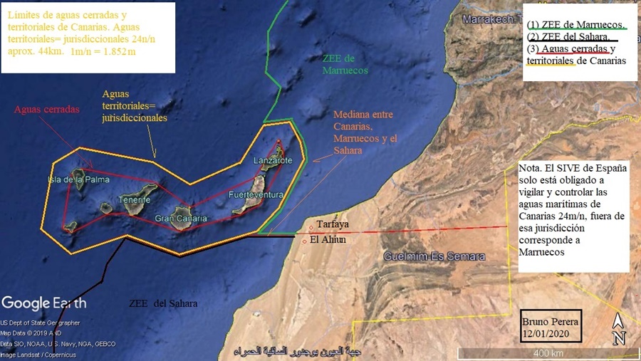 En casos de rescate de pateras, se debe tener en cuenta que Canarias aún no ha obtenido de Naciones Unidas las aguas cerradas ni tampoco las 24m/n de aguas de periferia marítima que nos corresponde. Y por causa de que todavía el Estado español no ha reclamado en Naciones Unidas lo que es nuestro, dicho ente internacional que es quien divide y concede los derechos sobre el mar y su lecho marino, está a la espera de que España se pronuncie en la reclamación. Pero si decimos hipotéticamente que podemos considerar que somos derechos habientes de esas aguas cerradas y de una periferia marítima de 24m/n=aprox. 44km; de todas formas, en esa periferia marítima nuestra mediana con Marruecos estaría en una franja diagonal a unos aprox. 44 km, este de Lanzarote y Fuerteventura. (Ver foto añadida). Esto nos aclara que más allá del límite de esa mediana corresponde a Marruecos vigilar sus aguas y prestar los servicios de SOS que sean de su competencia. Por otra parte Canarias no puede reivindicar que tiene derecho de cuidar y vigilar toda la ZEE habida entre nuestro archipiélago y la costa marroquí alegando que la Comunidad Europea nos concede ese privilegio, porque resulta que en cuestiones de Derechos del Mar la CE no tiene competencias más que en las aguas de ZEE y Plataforma extra continental de sus naciones ribereñas=continentales, pero no fuera de las aguas marítimas de las islas o archipiélagos que pertenecen a alguna nación que forma parte de la CE, como son los casos de España con Canarias, Portugal con Azores, Madeira y Salvajes, Dinamarca con Islas Feroe, etc. Por lo explicado el SIVE no debe actuar más allá de la periferia marítima de Canarias que es (aún aguas no obtenidas y que siguen en el limbo porque Naciones Unidas no nos las han concedido) 24m/n = aprox. 44km.