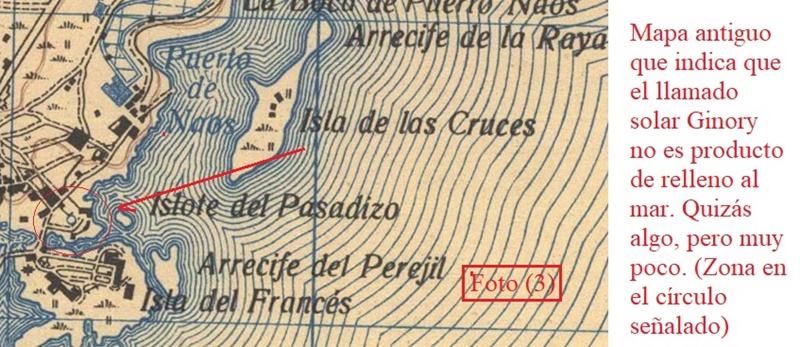 Según he apreciado de los tantos artículos que he leído, algunas personas piensan que el solar “Ginory” es producto de relleno con lo que se ganó terreno al mar, pero estudiando mapas antiguos, fotografías aéreas del año 1961 de Visor Grafcan y otras actuales de Google Earth, hallo que el solar “Ginory” no fue ganado al mar, “tal vez si una parte nimia, pero nada que podamos considerar como un robo de terreno al mar”.