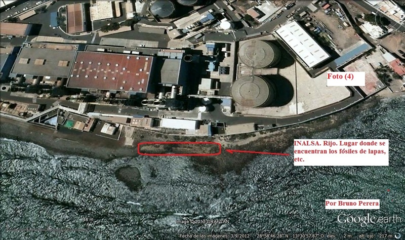 ..En otra ocasión de esas fechas, según filmaba el agua contaminada que derrama la potabilizadora Rijo en la orilla de mar; pasee unos metros por el borde de la costa cerca de la zona donde la desalinadora tiene los pozos de extracción de agua salada, y sin querer hallé fósiles de lapas parecida a las actuales llamadas (Patella Intermedia), y de otras caracolas, (Monoples Corrugatus), todo se encontraba y todavía se encuentra casi petrificado en la orilla, entre arena y piedras.