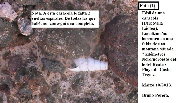 Haciendo la historia corta les cuento: Hace tiempo que tenía en mente buscar y encontrar señales geológicas y paleontológicas que me aseguraran la edad y el origen de Lanzarote. Por ello, en esos meses que he señalado, caminé unos días por toda la zona ya indicada, y para sorpresa mía, encontré varias caracolas de mar sobre las faldas de algunas montañas, sobre todo en fósiles que se hallaban y se hallan en barrancos y cunetas. (Caracolas no comestibles de unos 4cm de largo con unas 10 vueltas, llamadas científicamente, Turbovilla Láctea).