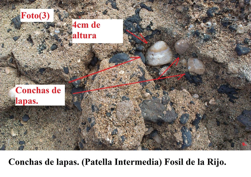 En esos fósiles, las conchas de lapas que se encuentran no son iguales a las que conocemos y que actualmente viven pegadas en las costas rocosas de Lanzarote, ni tampoco son idénticas a las que se encuentran vacías desperdigadas por doquier en diferentes lugares de la isla, y de cuales algunos dicen que fueron comidas por los guanches. Estas que se hallan en los fósiles frente a la Rijo, son totalmente de origen de una especie de lapa que posiblemente existió hace millones de años; y que tal vez vivieron cuando Lanzarote aun no había salido totalmente a la superficie y se encontraba sumergida unos metros bajo agua.