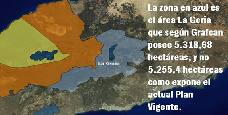 Y además al nuevo Plan La Geria se le añadiría las 63 hectáreas que le faltan al actual en su área que contiene en documento 5.255,04 hectáreas, cuando que en su realidad física posee 5.318,68 hectáreas, 63 hectáreas más -según informa Grafcan Gobierno Canario-. Y asimismo se corregiría la línea de parte del perímetro La Geria que corre atravesando por la mitad casas y fincas del pueblo de Uga, unas veces paralelamente y otras diagonalmente. Casas y fincas que con el nuevo plan se liberarían del error porque en presente no se pueden restaurar ni vender por causas de que la mitad de cada una, finca o casa, están protegidas por el actual Plan Especial del Espacio Protegido La Geria LZ10.