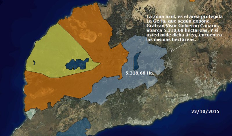 Si hacemos cuentas tomando las hectáreas que dice Grafcan Visor del Gobierno Canario que posee La Geria (L-10) 5.318,68 hectáreas y le restamos la cantidad de 5.255,04 hectáreas que se expone en el documento del Plan Especial del Paisaje Protegido La Geria, obtenemos que La Zona Protegida La Geria, tiene, según Grafcan Visor 63,64 hectáreas, más de las que se indican en el documento Plan Especial del Paisaje Protegido La Geria.