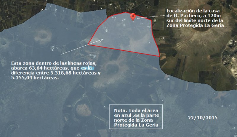 Entonces cabe decir: “-Si según Grafcan Visor Gobierno Canario, informa que la Zona Protegida La Geria abarca 63,64 hectáreas más de las que se menciona en el documento del Plan Especial del Paisaje Protegido La Geria”. significa que las medidas de los trazados de las líneas de límites que se señalan en el documento aprobado el 30/06/2010, no son las correctas, por lo que habrá que añadir a las 5.255,04 hectáreas, 63,64 hectáreas más. Pero el problema que se nos presenta es que a estas alturas -con lo complicada que está la situación territorial La Geria- es saber: ¿por cuáles lados le añadimos esas 63,64 hectáreas, o por cuáles lados se las restamos y luego se las añadimos en porciones a través de varios puntos de las líneas límites de La Zona del Paisaje Protegido La Geria?