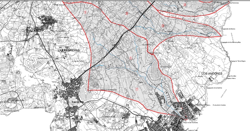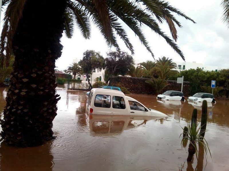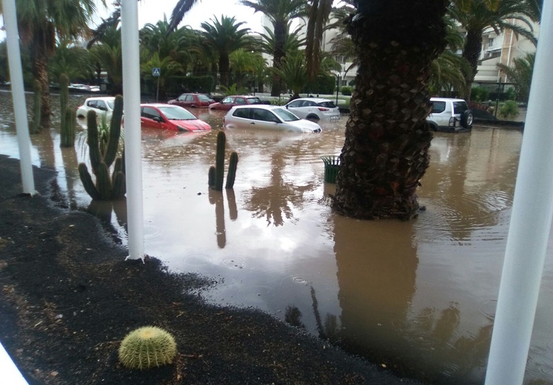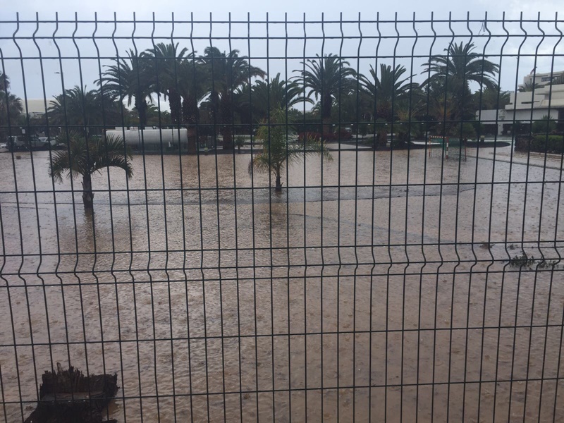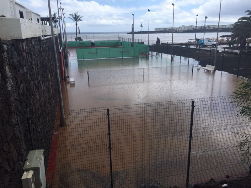 Así que: 1. Sin que llueva en Costa Teguise, el Barranco puede transportar un gran caudal de agua de su cuenca alta en la zona de Nazaret y el Castillo de Guanapay, que puede destrozar la playa en un instante. 2. Ninguna de las calles de Costa Teguise tiene imbornales y sus superficies actúan como enormes acogidas. El agua fluye hasta varios puntos como la rotonda al sur de Los Naranjos, pero el peor de todos se encuentra delante de la entrada principal del Hotel Los Zocos. Éste está construido en un alto, pero enfrente tiene el Hotel Las Salinas, que queda justo por debajo de la altura del rasante de la calle. 3. Todas las aguas pluviales de las casas, apartamentos y parcelas se vierten en el sistema de aguas fecales y, con una presión de 20 metros de agua, llega a las tapas del alcantarillado en el Paseo Marítimo. Éstas saltan con cada lluvia y vierten su contenido sobre la playa.