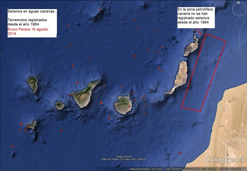 Por causa de que ya se está levantando polémica sobre los maremotos=seísmos que pudieran ocurrir durante los sondeos, y sobre todo durante la extracción del crudo o gas; añado mapa Google Earth donde ustedes pueden comprobar que en los últimos 40 años no se ha producido un maremoto=seísmo en la zona petrolífera canaria.