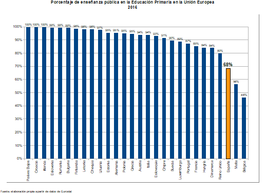 Bajo la bandera de la libertad de enseñanza se esconde, a veces, el clasismo y la insolidaridad. En la Unión Europea, que ponemos de ejemplo en tantas ocasiones, este debate y esta disyuntiva no existe. Para la gran mayoría de países y para todos sus partidos políticos -incluidos los más conservadores-, una enseñanza pública gratuita y de calidad es la mejor garantía de dos principios básicos de cualquier sociedad democrática: la cohesión social y la igualdad de oportunidades. Lo que ocurre en España, Bélgica o Malta, donde se dedican recursos públicos al mantenimiento de centros privados (con sus correspondientes privilegios en criterios de admisión e ideario), es la excepción que confirma la regla. El 90% de la oferta educativa europea es pública y, como es lógico y democrático, las familias que quieren optar por una enseñanza privada, más exclusiva, la pagan de su bolsillo.