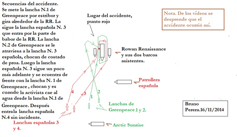 Se capta de estos dos videos que añado, uno tomado por no sé quién y otro por un miembro de la M/n. Arctic Sunrise que, el sábado 15/11/2014 sobre las 07 am, dos lanchas rápidas con varios activistas abordo procedentes de la nave Arctic Sunrise que se encontraba posicionada aproximadamente a un kilometro de distancia de la M/n. Rowan Renaissance, se pusieron en marcha hacia las cercanías de la mencionada nave. En ello dos lanchas rápidas de la patrullera española que vigilaba la zona las interceptaron y les dieron el alto, pero los activistas de Greenpeace desobedecieron la orden. Una lancha de Greenpeace escapó de las lanchas rápidas españolas hacia el Rowan Renaissance, cual fue perseguida por una de las lanchas españolas. Detrás de la lancha española que perseguía a la primera lancha de Greenpeace que se había escapado, salió la segunda lancha de Greenpeace filmando. Entonces la primera lancha de Greenpeace que había escapado se metió a toda marcha por la parte de estribor del Rowan Renaissance, que estaba custodiado por dos barcos asistentes, uno por cada lado y con una separación cada uno del Rowan Renaissance de más o menos unos 10m. Mientras la lancha de Greenpeace se fue por la parte de estribor del Rowan Renaissance, una de las lanchas españolas entró por la parte de babor del Rowan Renaissance y según dio la vuelta por la popa del Rowan se encontró que la lancha que perseguía se le había escapado dando la vuelta a Rowan Renaissance; en esto según la lancha española corría a gran velocidad siguiendo a la que se le había escapado; por la parte de estribor cerca del casco y hacia proa del Rowan, casi a mitad de su eslora se le cruzó con la proa la otra lancha de Greenpeace que había venido filmando toda la operación. La lancha española que no pudo parar en seco, le dio a la lancha de Greenpeace que filmaba un golpe con su la lado estribor proa provocándole un poco de daño en la mura de proa babor a la lancha de Greenpeace. La lancha española continúo unos metros más hacia adelante encontrándose de frente y chocando con la lancha primera que se le había escapado. En el alboroto cayó al mar una tripulante de a bordo de la primera lancha de Greenpeace que se había escapado, y en ese momento se dieron cuenta que había caído la tripulante de a bordo de la lancha que se había escapado y chocado, y gritaron varias veces desde la lancha de Greenpeace que filmaba: ¡una mujer cayó al agua, una mujer cayó al agua! Rápidamente un militar de la lancha española que había chocado con la lancha de Greenpeace que había escapado, se quito el salvavidas y se lanzó al agua para rescatar a la mujer que al momento fue subida a bordo de la lancha española. Mientras se acercó a sitio del siniestro a marcha lenta la segunda lancha española.