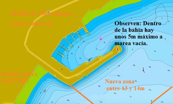 (A). Mientras escribía este artículo sobre el tan anunciado y discutido tema de la ampliación del Puerto de Playa Blanca, Yaiza Lanzarote; de la información que he encontrado en Internet, he llegado a la conclusión de que el muelle de Los Mármoles localizado en Arrecife y siendo un puerto del Estado, tiene capacidad de atraque para cruceros de los más grandes que tengan un calado de unos 9-10m porque la batimetría en el señalado lugar es de entre 15 a 20m a marea vacía=escorada, -barra donde está el nuevo espigón de 430m de largo-.