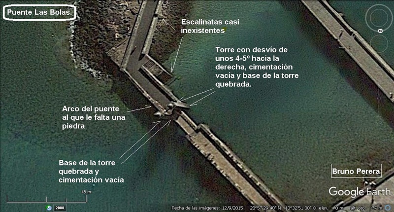 Durante unos 25 años por escrito y a través de varias emisoras de radio he denunciado unas 20 veces el deterioro que viene sufriendo el Puente Las Bolas. Espero que ahora que han hecho algo de caso tengan en cuenta las reparaciones que necesita. Por ejemplo deben tomar en cuenta: (1) las dos bases de las torres están quebradas y una tiene un desvío de unos 4-5º, hacia la derecha mirando desde tierra. (2) la cimentación de los arcos y las de las dos bases de las torres están casi vacía. (3) un arco del puente, el de la izquierda, tiene una piedra caída. (4) y las escalinatas, la grande y la pequeña, ya casi no existen debido a la corrosión por la marea y la sal de mar.