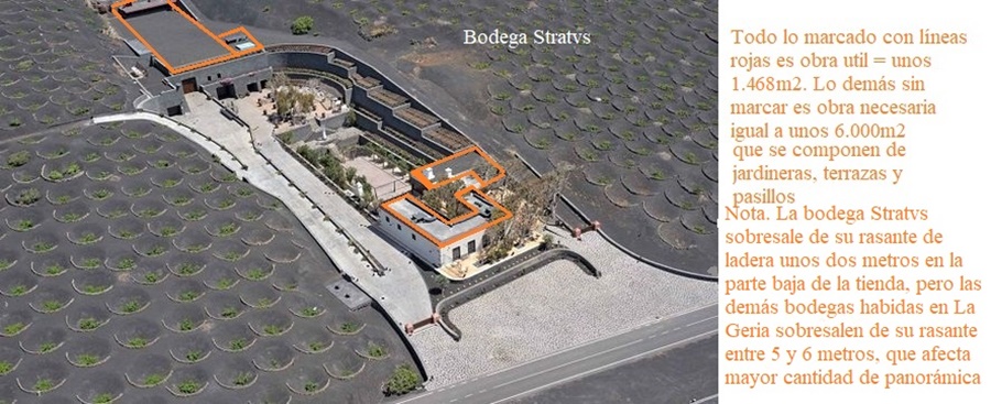 (13). En resumidas cuentas, se puede decir que Stratvs recibió licencia para hacer una bodega de 900m2, y con la misma venia una sala de máquinas de unos 200m2, unos baños de 150m2, y la restauración de una casa antigua en ruinas de unos 218m2, que en total serían= a 1.468m2 de obra útil. Más obra necesaria unos 6.000m2 entre pasillos, terrazas y jardineras, todo empedrado que es mejor para el subsuelo porque no destruye la fertilidad de la tierra como lo hace el lapilli que han usado otras bodegas para hacer sus terrazas y pasillos.