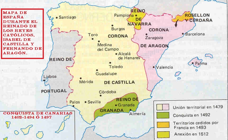 Reinando en Castilla Enrique III entre 1390-1406, en 1402 el normando Jean de Bethencourt negoció con dicho monarca la conquista de Canarias, y posiblemente después de su muerte mientras reinaba su hijo Juan II 1406-1455, J. de Bethencourt le ofreció la venta de la conquista de las islas: Lanzarote, Fuerteventura y La Gomera que, el normando decía poseer como suyas. Postre 1476 los Reyes Católicos de Castilla y Aragón, Isabel y Fernando, reiniciaron la conquista de las restantes islas: Gran Canaria, Tenerife, La Palma y El Hierro, cuya colonización terminó, para unos en 1494 y para otros en 1497. Reinando los mismos reyes en 1491 reconquistaron el último bastión de Granada que seguía ocupado por bereberes y árabes. Mientras aun vivían Fernando e Isabel, también conquistaron Melilla en 1497. Asimismo después de la muerte de Isabel 1504, durante los últimos años de vida del rey Fernando, dicho monarca comenzó a anexionar a Castilla y Aragón el Reino de Navarra a partir del 1512 cual se logró anexionar unos 12 años después de su muerte en 1528 mientras reinaba su nieto Carlos I. (Más adelante en otras plazas africanas España consiguió control colonial cual hoy forman la totalidad de España con Ceuta y las Islas Chafarinas.