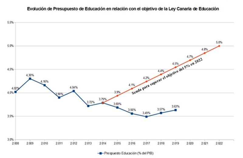 En estos años de bonanza y mejora económica, el PIB y los ingresos de la comunidad autónoma se han incrementado notablemente. El Gobierno de Canarias disponía de recursos suficientes para realizar los “incrementos progresivos” que dicta la Ley y hacer posible el objetivo del 5% en 2022. Sin embargo, no ha habido interés ni voluntad política. Lo gravede los incumplimientos producidos es que, además dedificultarla senda de financiación necesaria, siguen sin afrontarselos graves problemas que comprometen el futuro de la educación canaria.