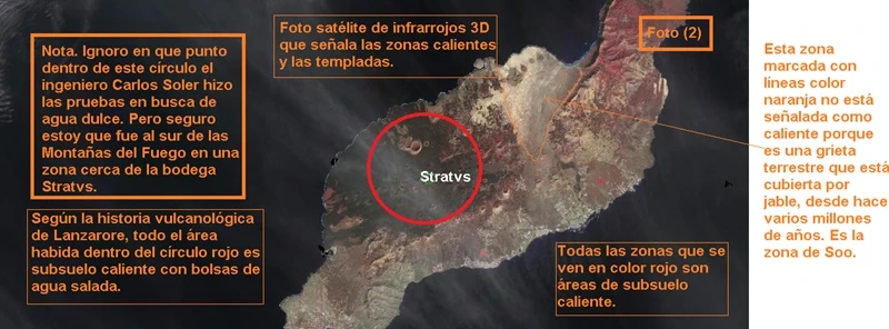 También toda esa fantasía que alega el ingeniero señor Carlos Soler, acerca de que el agua dulce habida en esa supuesta bolsa es producto de la que corría por los barrancos=redes-hídricas que habían antes de las erupciones que sucedieron en los años 1730-36 y 1824, y que después de que los barrancos fueran cubiertos por la lava de las erupciones el agua que antes desembocaba por ellos en el mar, lo ha estado haciendo desde postre las erupciones hacia el subsuelo y hacia acuiferos ¡eso es una falacia! porque según los mapas de Google Earth 3D infrarrojos exponen: "el subsuelo de la zona La Geria es caliente". Y aparte con la poca lluvia que se da en Lanzarote, unos 25cm por m2 por año, es imposible que se formen bolsas grandes de agua dulce.