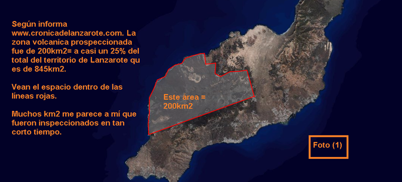 Si la zona inspeccionada es de 200 km2, eso es igual a un 25% de la superficie terrestre de Lanzarote. Es también igual a casi toda la zona volcánica que comprende La Geria y otro tanto. Lanzarote posee de territorio unos 845km2.