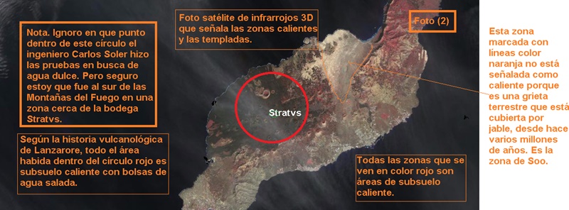 También toda esa fantasía que alega el ingeniero señor Carlos Soler, acerca de que el agua dulce habida en esa supuesta bolsa es producto de la que corría por los barrancos=redes-hídricas que habían antes de las erupciones que sucedieron en los años 1730-36 y 1824, y que después de que los barrancos fueran cubiertos por la lava de las erupciones el agua que antes desembocaba por ellos en el mar, lo ha estado haciendo desde postre las erupciones hacia el subsuelo y hacia acuiferos ¡eso es una falacia! porque según los mapas de Google Earth 3D infrarrojos exponen: "el subsuelo de la zona La Geria es caliente". Y aparte con la poca lluvia que se da en Lanzarote, unos 25cm por m2 por año, es imposible que se formen bolsas grandes de agua dulce.
