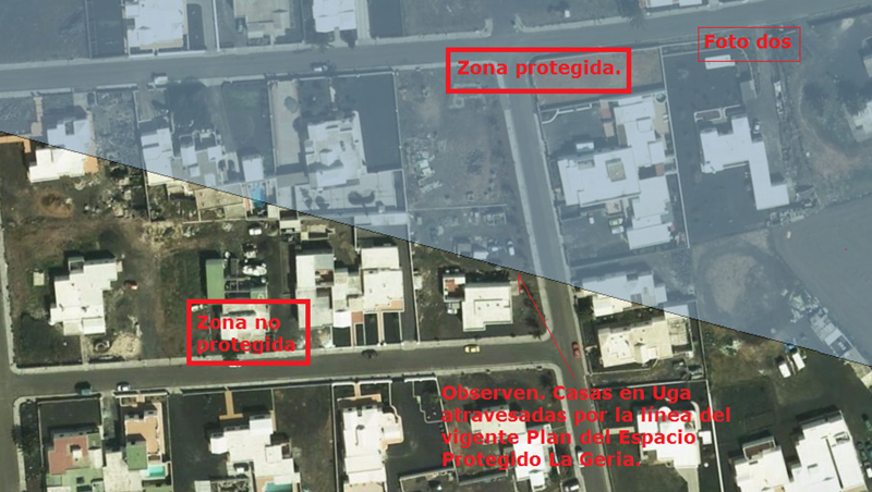 (4). El Perímetro del Plan Especial del Espacio Protegido La Geria, tiene incluso errores de trazado porque sobre todo en la zona de Uga pasa la línea divisora a través de varias casas y fincas cortando unas veces un hogar diagonalmente y en otros en una recta, que en ambos casos divide la propiedad en dos trozos. Y por si fuera poco, en otras ocasiones la línea del perímetro divide una ventana o una puerta, que sólo da derecho al dueño del inmueble afectado poder con licencia del ayuntamiento correspondiente y del Cabildo, restaurar la parte protegida dejándola en su estado original, y la no protegida también con sus licencias correspondiente, podría restaurarla, pero siguiendo la línea del perímetro, por lo que en algunas situaciones debe restaurar los espacios en forma de tres esquinas, algo así como hacer habitaciones triangulares. Con algunas fincas ocurre otro tanto. Hay fincas que están plantadas con hoyos de parras, cuales la mitad está protegida y la otra libre, por lo que el propietario si lo desea puede modificar la parte no protegida y no la protegida.