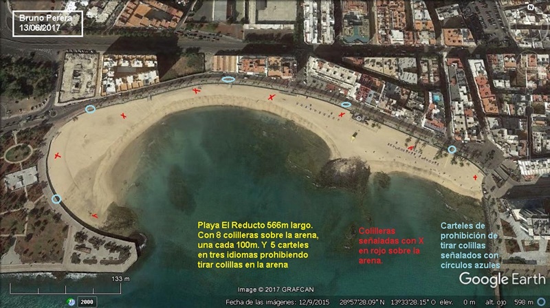 He calculado que la Playa El reducto tiene unos 566m de largo, pues entonces si colocan una colillera de acero inoxidable de unos 50cm de diámetros x 1m de altura enterrada sobre la arena cada 100m, que serían 8 unidades en total, conseguirían que los fumadores fumen alrededor de las colilleras, y así también nadie tiraría colillas sobre la arena, y tampoco se molestaría a los no fumadores. El policía que estuviera de guardia haría cumplir este requisito. -Y creo que con lo que aconsejo no habría necesidad de que un policía cuide la playa porque después de un tiempo la gente se mentalizaría con el sistema-.