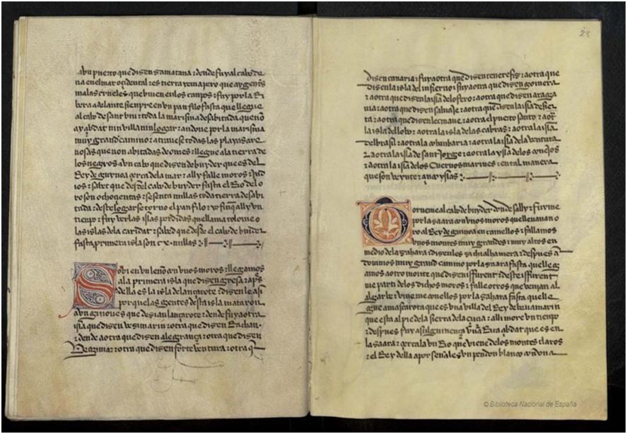 Sobi en vn leño con vnos moros & llegamos a la primera isla que dizengresa a apresdella es la isla de lançarote&dizen le asi porque las gentes desta isla mataron ávnginoues que dezianlançarote& dende fuy a otra isla que dizenbezimarin& otra que dizenRachan . / dende a otra que dicen alegrança& otra que dizenUegimar& otra que dizenforte ventura & otra que dizen canaria &fuy a otra que dizentenerefiz& a otra que dizen la isla del infierno &fuy a otra que dizen gomera & a otra que dizen la isla de lo fero& a otra que dizenaragauia& a otra que dizensaluaje& a otra que dizen la isla desierta & a otra que dizenlecmane& a otra el puerto santo & a otra la isla del lobo & a otra la isla de las cabras &a otra la isla del brasil& a otra la colunbaria& a otra la isla de la ventura & a otra la isla de santjorge& a otra la ysla de los conejos & a otra la isla de los Cueruos marines & en tal manera que) son veynte&çincoyslas