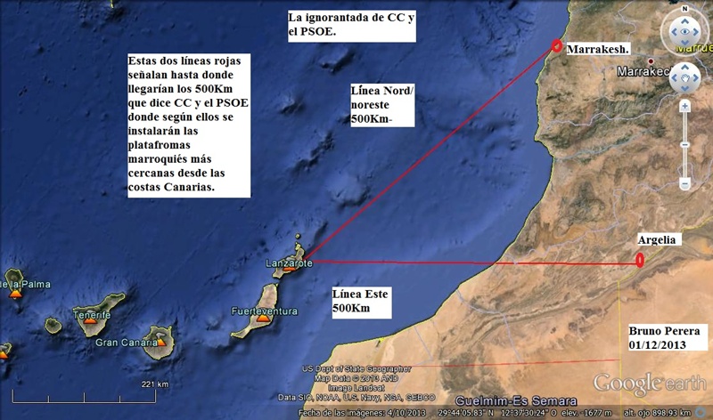 2. CC y el PSOE, dicen: Los sondeos marroquíes más cercanos a las costas canarias se harán a una distancia de unos 500km Este. (Error y manipulación). Contesto: los sondeos más cercanos a las costas canarias Juby I, Juby II y Juby III, se harán a una distancia Sur/este, Este y Nord/este, variables entre 100, 106 y 155Km. (CC y el PSOE no saben de geografía, o bien se hacen los ignorantes para manipular porque con 500Km desde Lanzarote Nord/noreste, se llega a Marrakech, y rumbo Este, a 30Km después de la frontera marroquí en Argelia.
