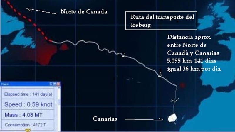 "Los icebergs son como embalses flotantes", repite el científico francés, para el que es un desperdicio imperdonable que este recurso se diluya en el océano cuando el iceberg se derrite. El viaje comienza el 3 de junio en Terranova y se ha calculado en la simulación para un iceberg de siete toneladas. Durante 141 días es remolcado a un nudo de velocidad y, a mediados de noviembre, llega a Canarias. Eso sí, con un 38 % de su volumen menguado por el calor.
