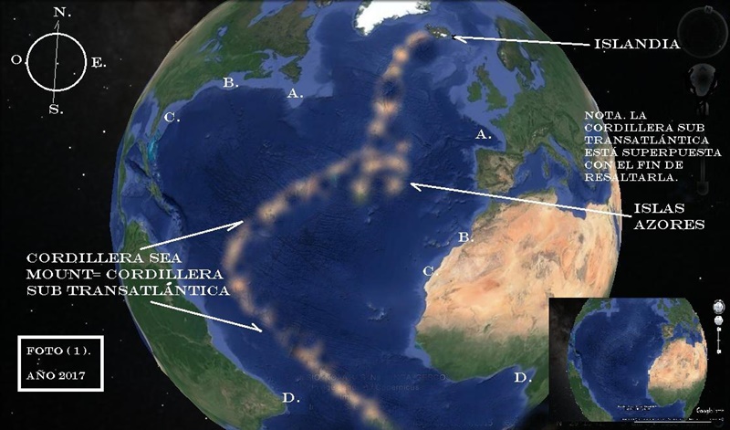 Post datum:. (1). Observen que en la foto de Google Earth número (1) pueden apreciar que las letras que indico muestran que el (Pangea) fue cierto que ocurrió porque tanto las orillas de costas de Europa, África y América son una separación réplica que concuerda. E incluso la grieta Cordillera Sub Transatlántica= Seamount, igualmente es una réplica de tal separación continental. Lo pueden comprobar con Google Earth.
