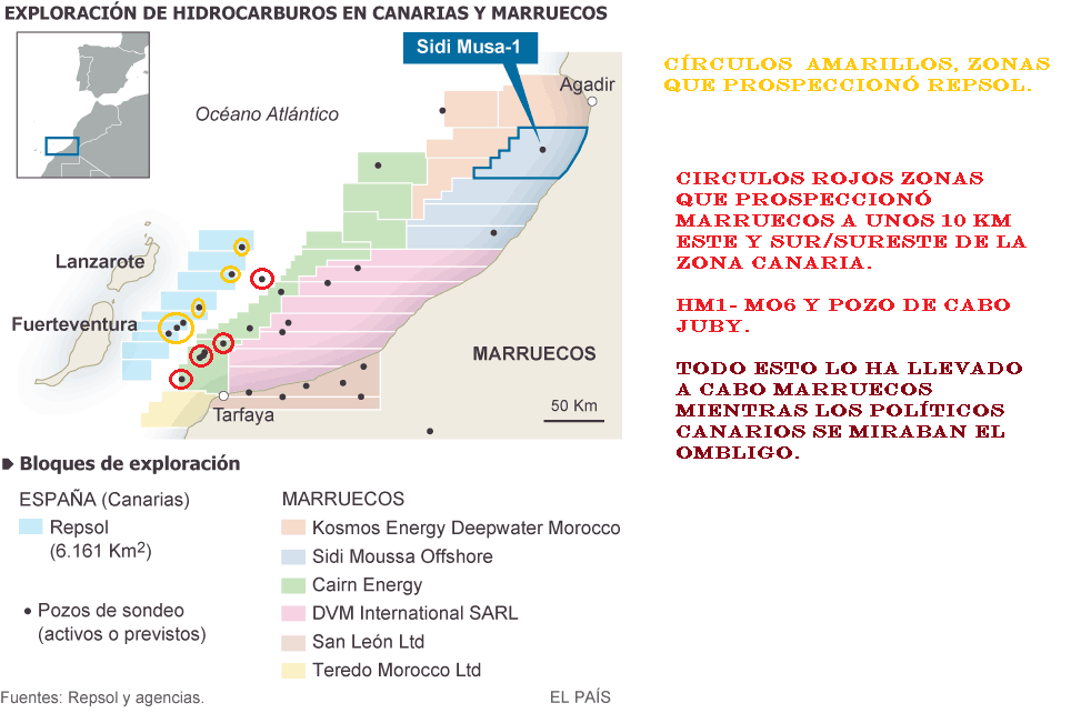 (1). En el área petrolífera de Tarfaya localizada a unos 90 kilómetros este de Fuerteventura y que en presente está resucitando nuevas controversias; antes del año 2010 ya Marruecos había hecho prospecciones, e incluso después del 2014, y alegaron que habían encontrado crudo muy espeso y que por causa tendrían que hacer análisis y valorar si sería o no rentable extraerlo. También en otras muchas zonas Marruecos ha hecho prospecciones y ha localizado bolsas con posible gran contenido de petróleo y/o gas. (En las aguas de ZEE de dicha nación, las zonas que poseen ya marcadas para prospeccionar son un área el doble del archipiélago canario en km2).