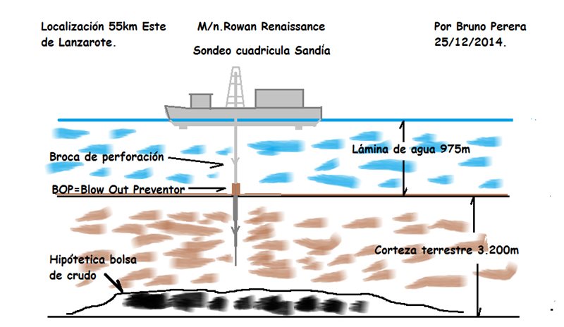 Nota. Si Repsol ya el día 19 de diciembre había perforado 2.756 metros, y si el total de metros desde el lecho marino a la bolsa es de unos 3.200 metros, picará la bolsa unos días después del Año Nuevo. Pienso que más o menos en fecha 05/01/2015 se sabrá si hay o no indicios de petróleo y/o gas en aguas de la ZEE de Canarias.