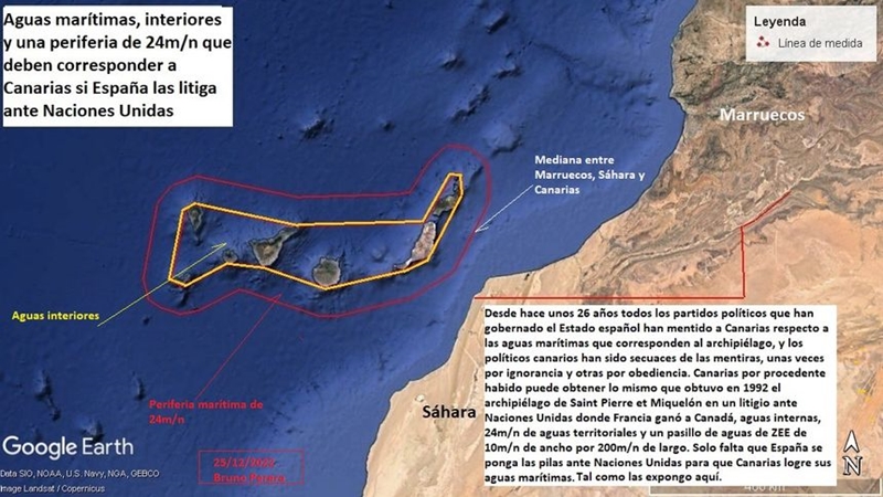 Sepan asimismo que España en el año 2009 presentó ante Naciones Unidas una reclamación de aguas de ZEE 200m/n y de Plataforma Continental Extra de 150m/n, desde la isla La Palma hacia el oeste, pero nada sobre la mediana entre Canarias y Marruecos porque España sabe que hacia el este solo podrá obtener aguas interiores entre islas y una periferia marítima de 24m/n de aguas territoriales, siempre y cuando lo litigie ante Naciones Unidas.