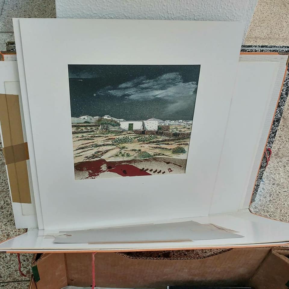 El carácter que imprime a la obra gráfica es lo que realmente atrapa. Tiene fuerza. Eso que podríamos denominar panteísmo en sentido figurativo. Resume en trazos y color lo que encierra el volcán, el rofe y la cal. El rojo, el negro y el blanco. Pasión, oscuridad y luz. Y cielos. ¡Y vaya cielos! Atmósferas etéreas que amanecen y se acuestan bañadas por estrellas que hacen aún más intenso el paisaje conejero. Es tal la sublimación del paisaje que Kant habría firmado una de sus categorías estéticas con cualquiera de estas obras. Hay una naturaleza que emerge de una tierra donde la vida es latente en contraposición a la soledad de las viviendas.