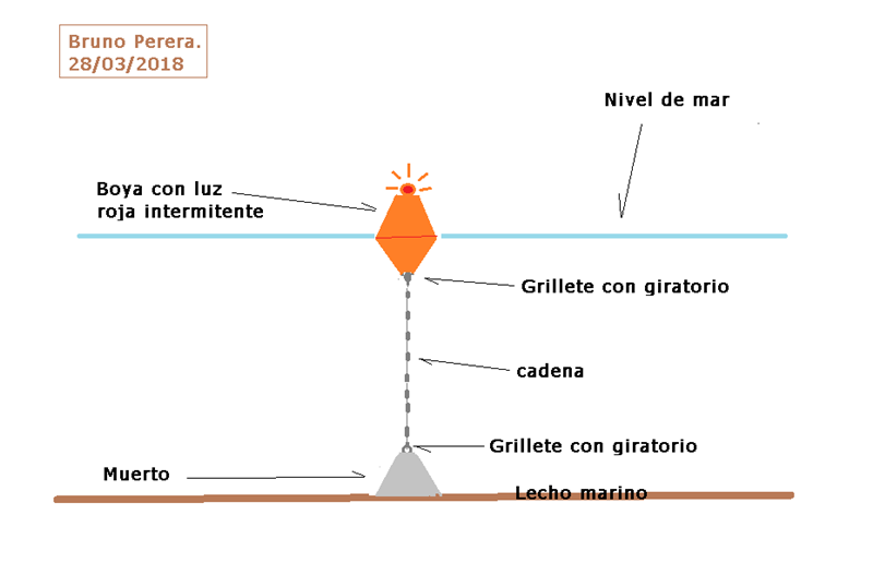 Nota. También el enganche que lleva el muerto debe ser grueso y de acero inoxidable. Y tanto el grillete que amarra la boya como así el que se sujeta al muerto deben tener giratorios para que no rompa la cadena cuando la boya se mueva durante un mal tiempo.