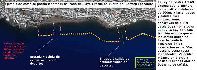 Hoy día el balizado de Playa Grande ya no existe; y es por ello que propongo que para el balizado de cualquier playa en Lanzarote se haga con boyas de acero inoxidable, con cadenas también del mismo metal de eslabones de un tamaño adecuado, con buenos amarres y con luz roja intermitente.