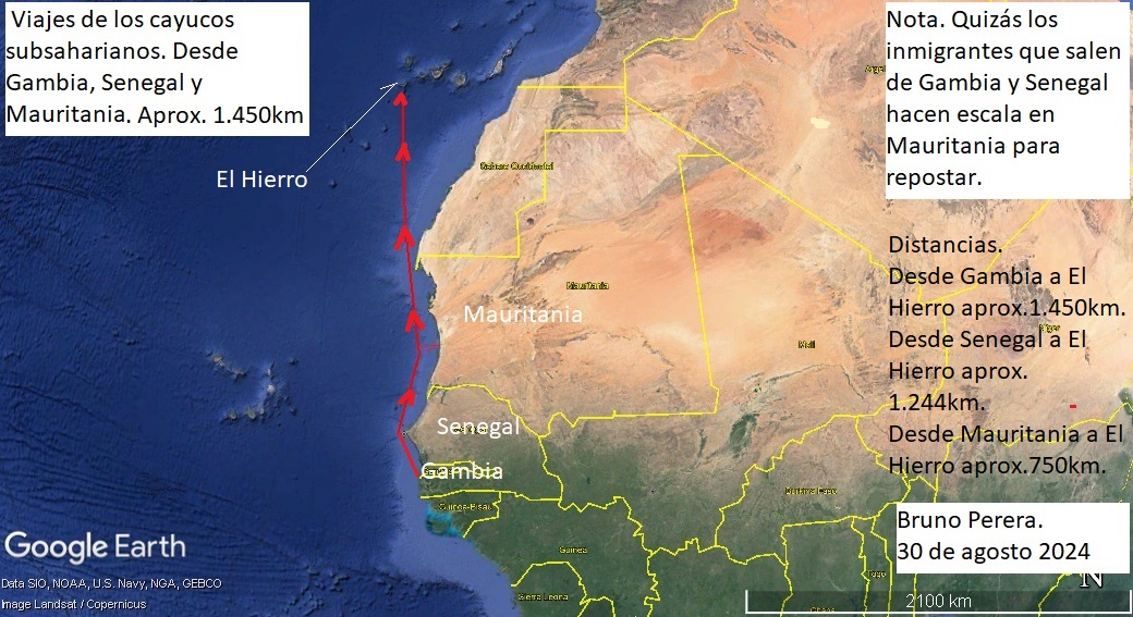 Por otro lado, Pedro Sánchez presidente del Gobierno español viajó el 28 de agosto de este año a Mauritania, Senegal y Gambia para negociar acuerdos con esos países, según él, en pro de aminorar los cayucos que parten hacia Canarias. Algo que P. Sánchez no pudo conseguir porque los cayucos no han dejado de llegar a El Hierro y a otras islas.