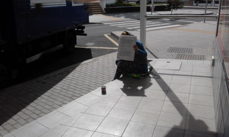 Hoy cuando entré a comprar unos artículos en el Supermercado SPAR situado en la calle Pedro Barbas de Puerto del Carmen, vi que había una joven rumana de unos 22 años pidiendo limosna a través de un cartel con tres mensajes en tres idiomas con el que trataba de dar pena para obtener unas monedas que al final de su jornada. Personas como esta suelen llegar a juntar unos 100 euros o más de recaudación.